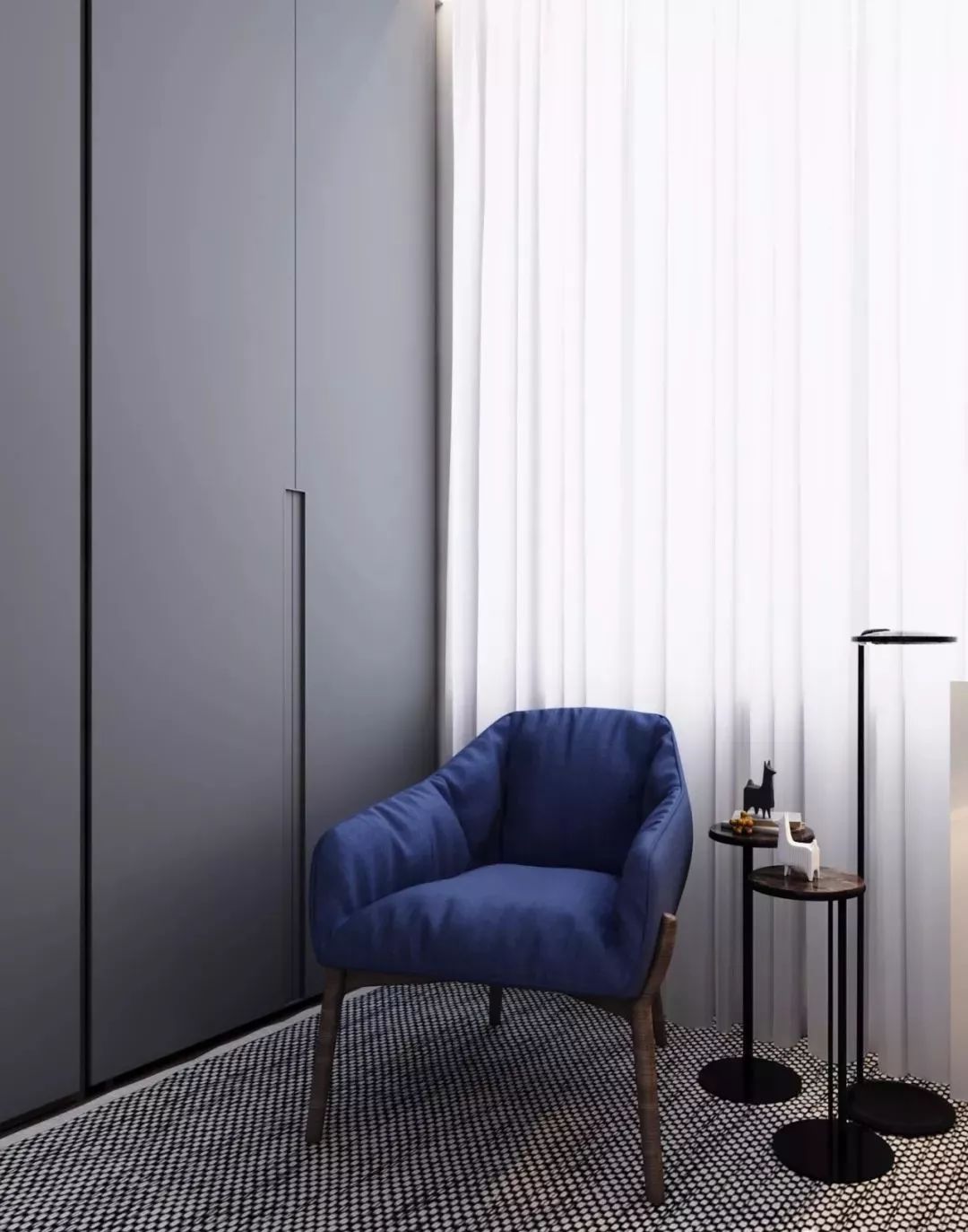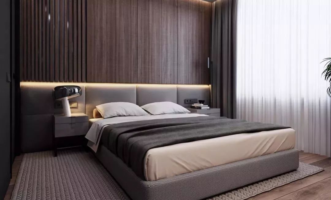 卧室以黑色、中性色为主,加上木质的背景墙,去掉不必要的配饰,铺上地毯,就够了。