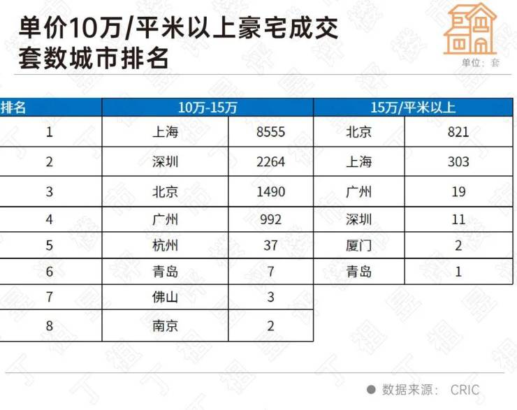 另外上海单价15万元/平米豪宅成交了303套,较去年同期多了6套。