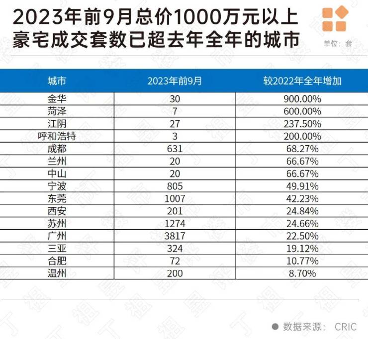 另外,三四线城市金华、菏泽、江阴和呼和浩特前9月总价1000万元豪宅已较2022年全年翻倍。
