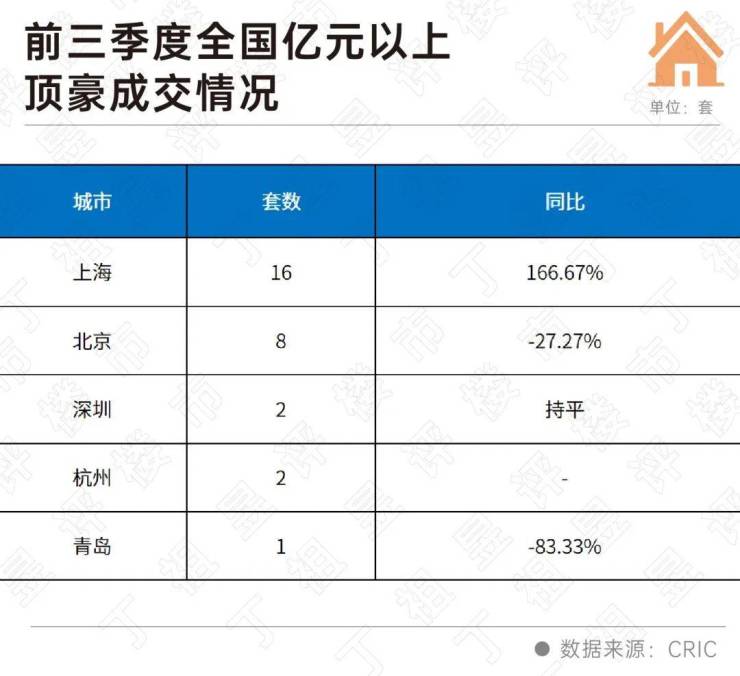 前三季度,全国过亿豪宅共成交29套,上海就占了一半,成交了16套,同比涨幅达到166.67%,北京过亿豪宅成交8套,较去年同期少了接近三成。