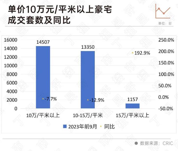 从各单价段来看,10-15万元/平米豪宅成交13350套,较去年同期减少12.9%。