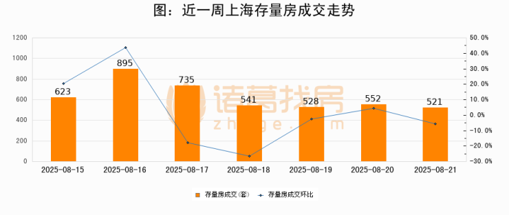 从存量房来看,2025年08月21日上海存量房单日成交521套,比昨日减少31套,环比下降5.6%。从近一周存量房成交来看,上海存量房日均成交套数为627套,08月21日单日成交521套,低于近一周平均水平16.9%。