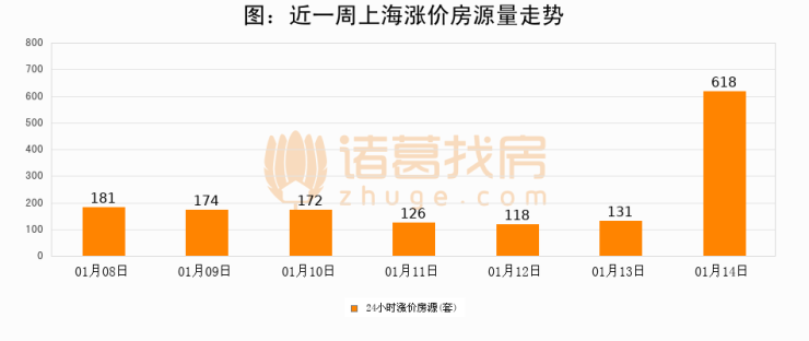 根据诸葛找房数据显示,上海24小时涨价房源量为618套,较01月13日增加487套,环比上涨371.8%。与此同时,涨价房源占比小幅扩大,业主信心有所提升。