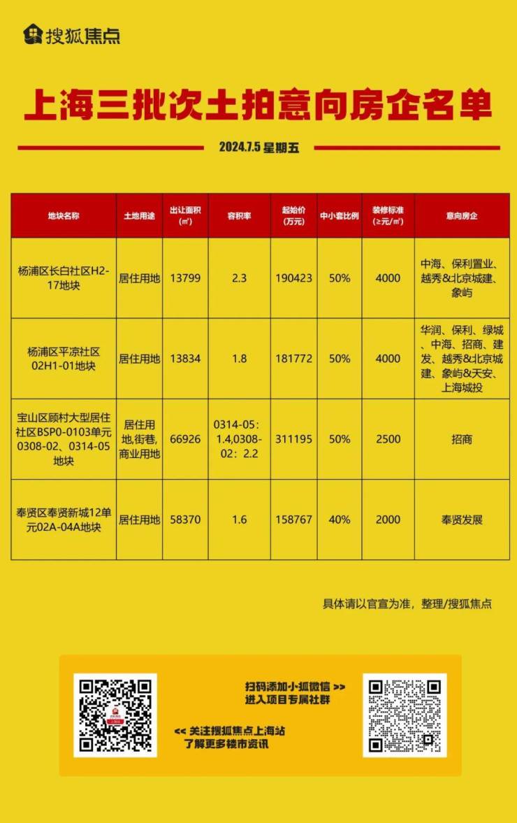 上海三批次土拍将于7月9日开启,共4幅地块,出让总面积约15.29万平方米,起始总价84.2157亿元。随着今日中午12点保证金截止,具体意向房企名单也正式曝光。