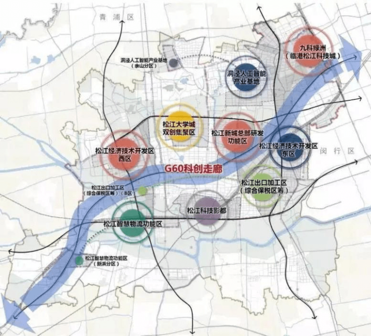 那么问题来了,上海下一个城市更新发展的节奏点在哪?作为向全球科创中心进军的科创之城——上海,除了拥有张江科学城,还有G60上海松江科创走廊在上海科创版图中,松江G6科创走廊始终占据着龙头位置,松江新城作为G60科创走廊的策源地,紧紧围绕“一廊九区”来打造未来发展战略空间和经济增长极。