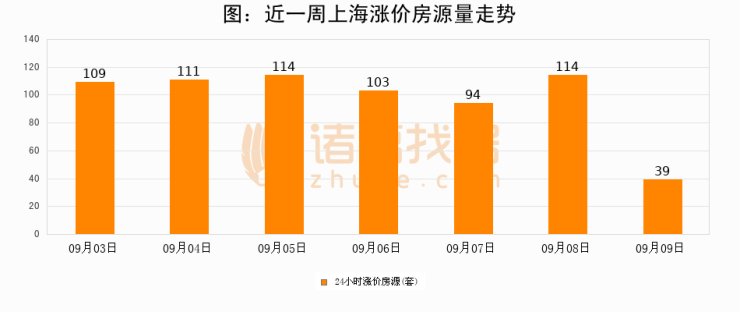 根据诸葛找房数据显示,上海24小时涨价房源量为39套,较09月08日减少75套,环比下降65.8%。与此同时,涨价房源占比小幅回落,对于购房者来说是一个入市窗口期,购房者可抓住时机入市。