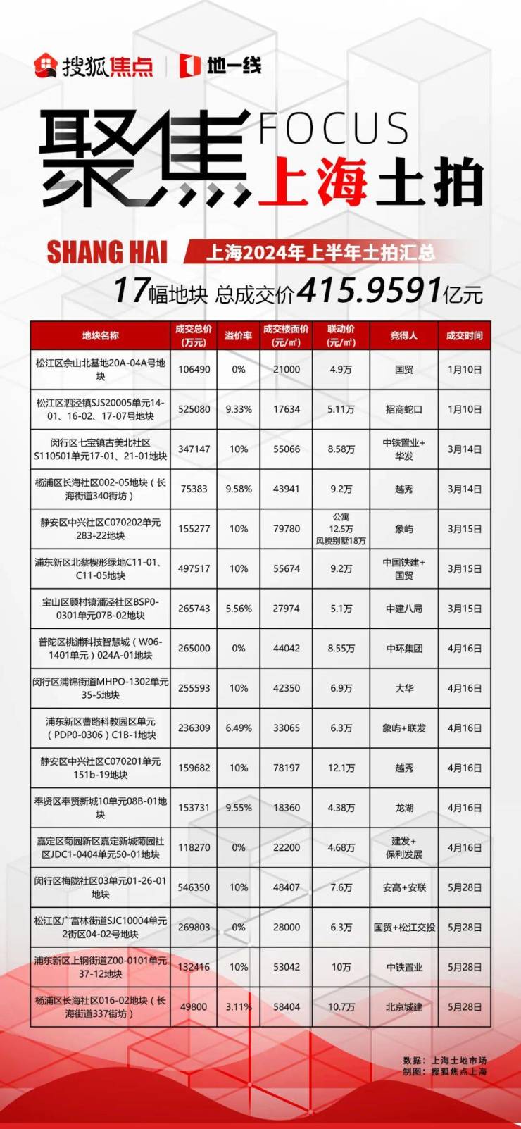 上海上半年17幅涉宅地块总揽金约415.96亿元,下半年土拍重回“价高者得”