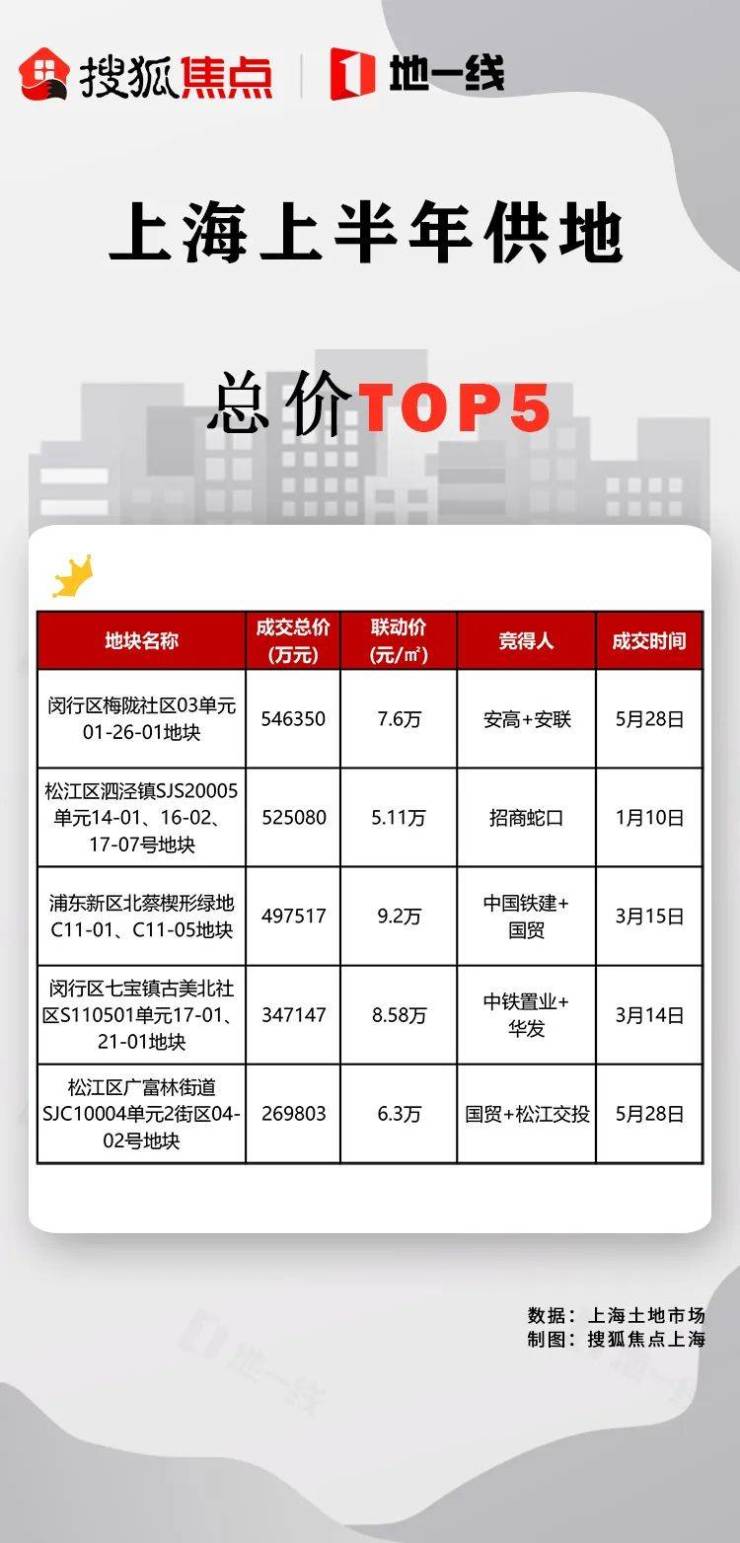 “总价”最贵地块TOP5分别为安高+安联闵行地块、招商蛇口松江地块、中国铁建+国贸浦东地块、中铁置业+华发闵行地块、国贸+松江交投松江地块。