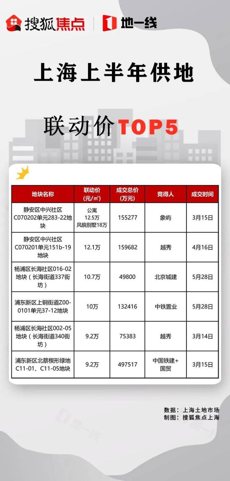 “联动价”最贵TOP5分别为象屿静安地块、越秀静安地块、北京城建杨浦地块、中铁置业浦东地块、越秀杨浦地块、中国铁建+国贸浦东地块。象屿静安地块公寓联动价12.5万/㎡,风貌别墅联动价18万/㎡,为上半年联动价最贵的地块。