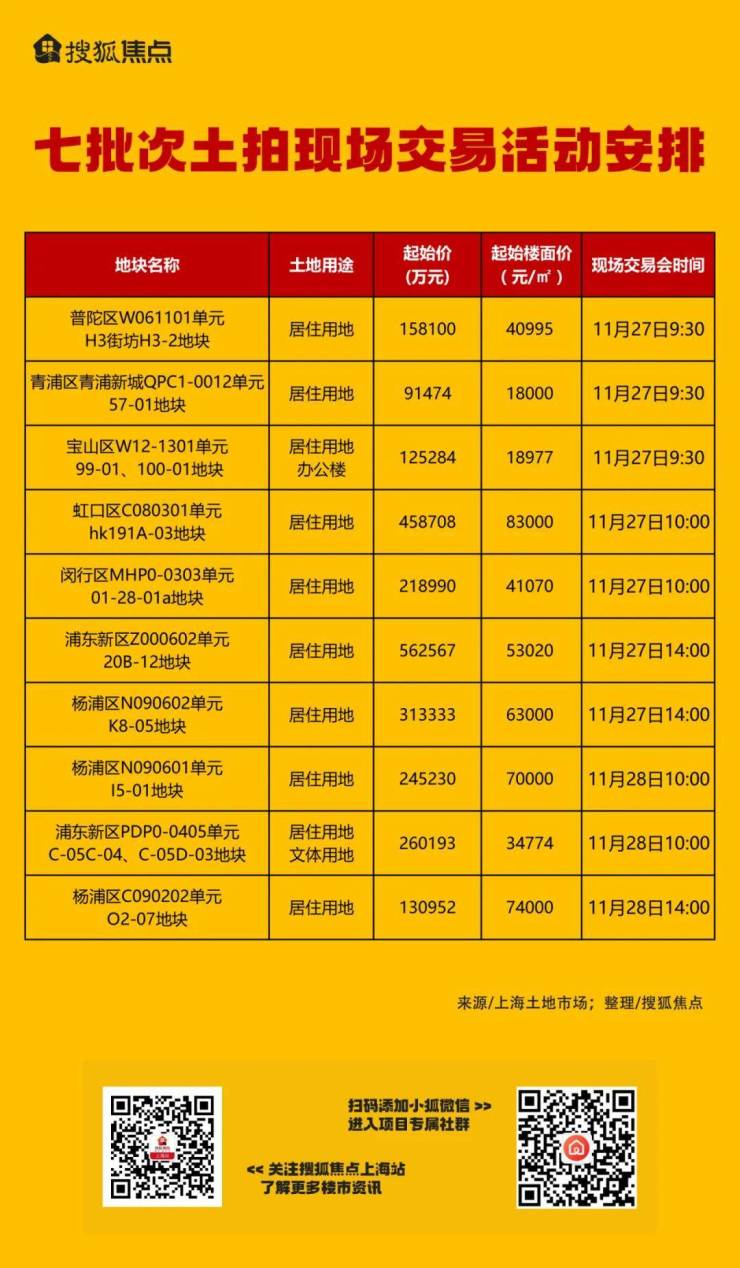 11月26日上午,上海土地市场官网发布通知,公布了七批次土拍现场交易活动安排,将于11月27-28日举行现场交易会。地块合计出让面积近25万平方米,起始总价约256.48亿元。