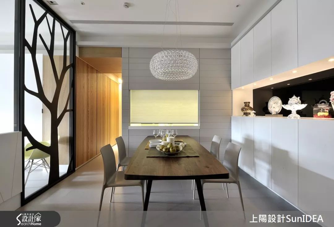 在家要如何创造令人惊喜的小乐趣? 设计师将书房与餐厅的隔断,以玻璃与造型树取代实墙,不论在书房或是餐厅,都能看到家人的动态,大树造型的树影,也为家里增添一分童趣感。