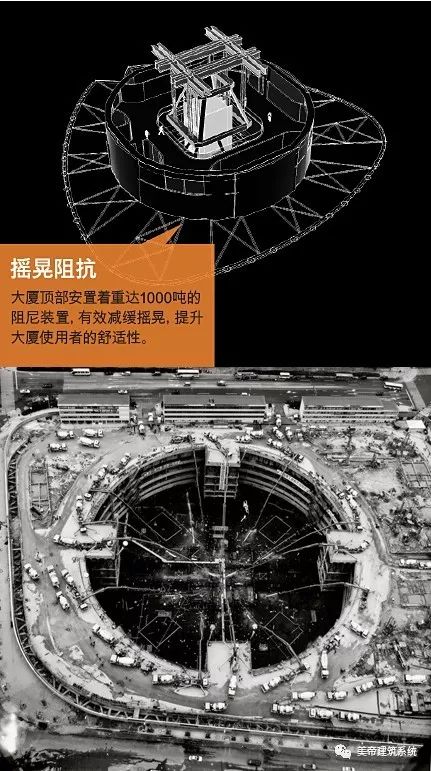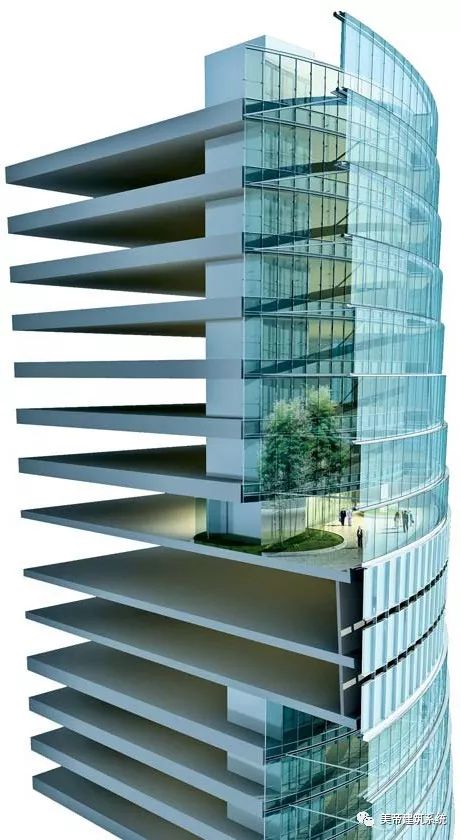 大厦如同一棵挺立的大树,有一个钢筋混凝土核心筒作为强壮的树干,和许多位于每个分区基底的树枝,这些树枝支撑着避难层和设备层,将建筑分隔为九个区块,分区结构加快了建设速度,降低结构成本。
