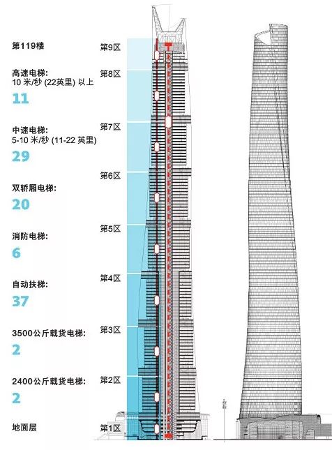 同时大厦采用由三菱电机设计的三部高速电梯,转瞬之间全可将乘客送达位于119楼的观光层,秒速高达18米,相当于时速60公里。