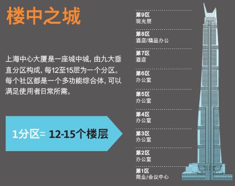上海中心大厦的设计旨在拥抱并激活都市生态,大楼设计一改将公园在城市中水平铺展开来的方式,打造出垂直堆叠的聚合空间,这座大楼被认为是一个“自成一体的城市”。整个大厦分为9个垂直的区域,每个区域在12到15层之间。每个社区都是一个多功能综合体,可以满足使用者日常所需。