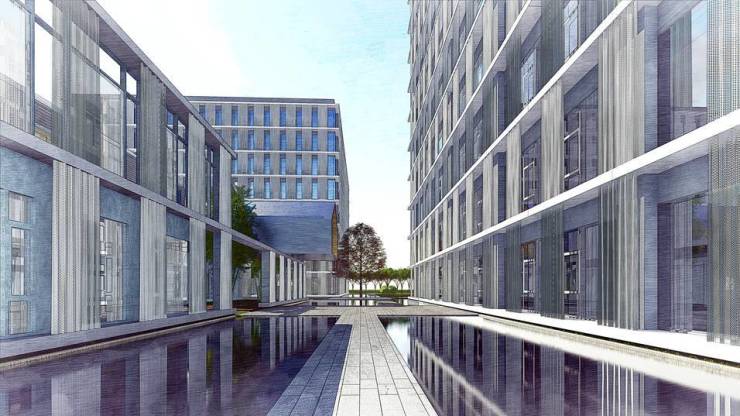 沿现代风格景观,自然天成;水景悠然,清风竹影,四季皆景;打造多元,生态活力办公。