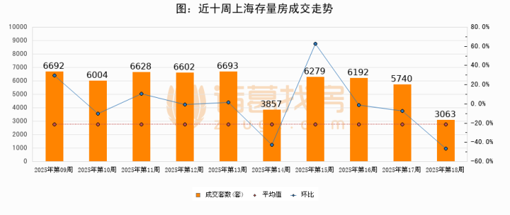 存量房方面,第18周上海存量房成交3063套,较上周减少2677套,环比下降46.6%。从近十周成交走势来看,周均成交套数为5775套,本周低于平均水平47%。