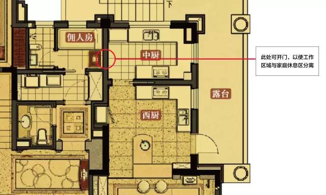 厨房,家庭室以北,总面积近25平,与15平的露台相连,保证了采光通风,并由隔墙分割成中厨和西厨,靠近家庭室的为西厨,无油烟。整体看,厨房区域位于整套房屋的东侧,东方属木,厨房属火,木生火旺,寓意主人红红火火。