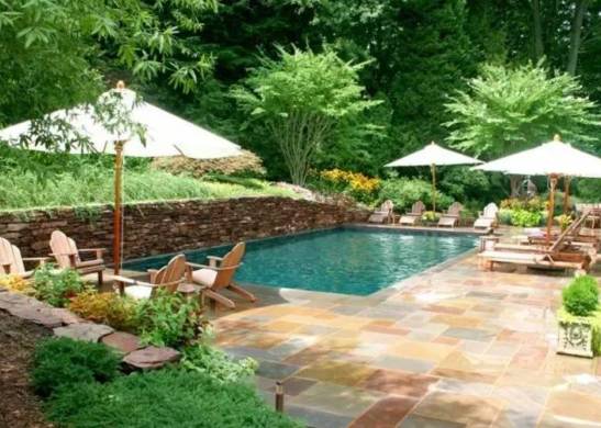 可挖个25*10米室外泳池,简单的木制躺椅和遮阳伞。