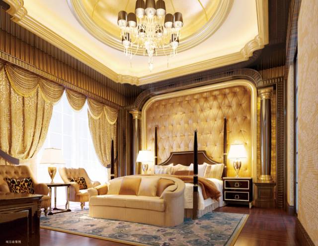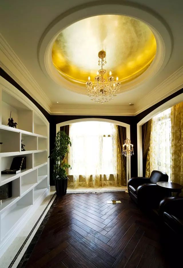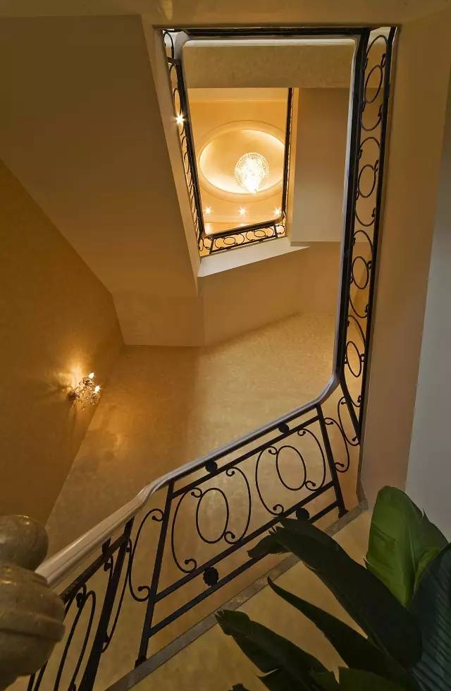 楼梯采用顺时针螺旋设计,寓意顺气,暗含财运事业平步青云,楼梯顶部为屋顶挑高艺术穹顶,可悬挂大型吊灯,气派华丽。