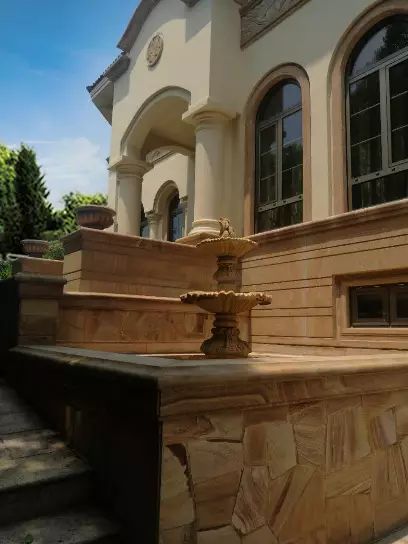走近点,看下外立面,澳洲砂岩配以砂岩浮雕。