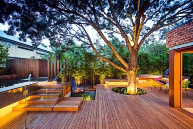 沿廊处铺些防腐木,配小桥流水,假石盆栽,各式雕塑,让夜晚变得更浪漫……