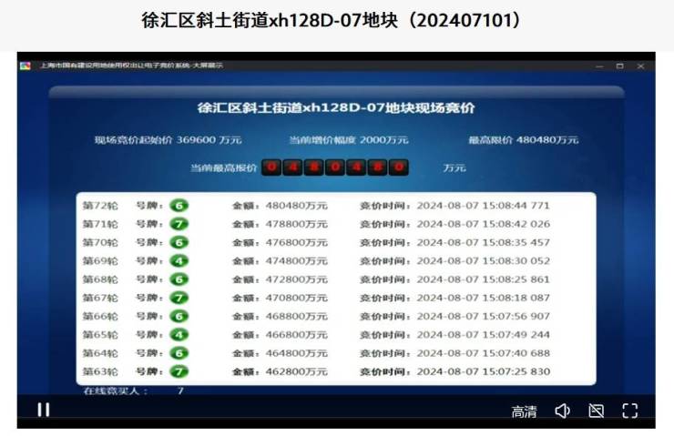 与其他挂牌方式出让的地块不一样的是,该地块设置了最高限价:48.048亿元。现场竞价环节,经过多达72轮报价到达最高限价,由招商+徐汇城投报出。