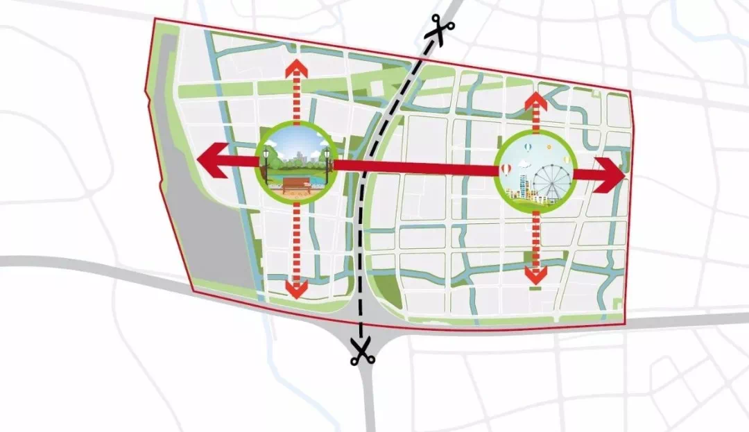 设计策略1——整合与联通,打造东西向跨嘉闵高架多功能主线轴,构筑区域亮点突破