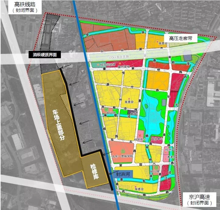 封浜新镇总体城市设计,位于上海市嘉定区南部,毗邻大虹桥商务区,是嘉定区与上海主城区接壤的最前沿,区位条件优越,发展潜力巨大。但是这里被工业园、铁路、地铁车站所包围,条件较为复杂。