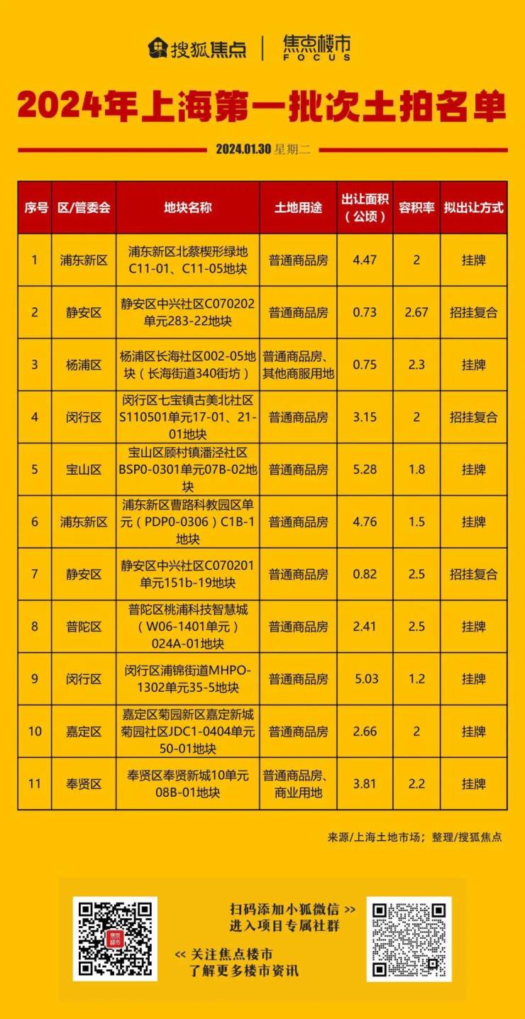 1月30日,上海土地市场官网发布公告,预告了2024年第一批次拟出让住宅用地名单,含浦东新区、静安、闵行各2幅,普陀、杨浦、宝山、奉贤、嘉定各1幅。11幅地块总出让面积28.84公顷。