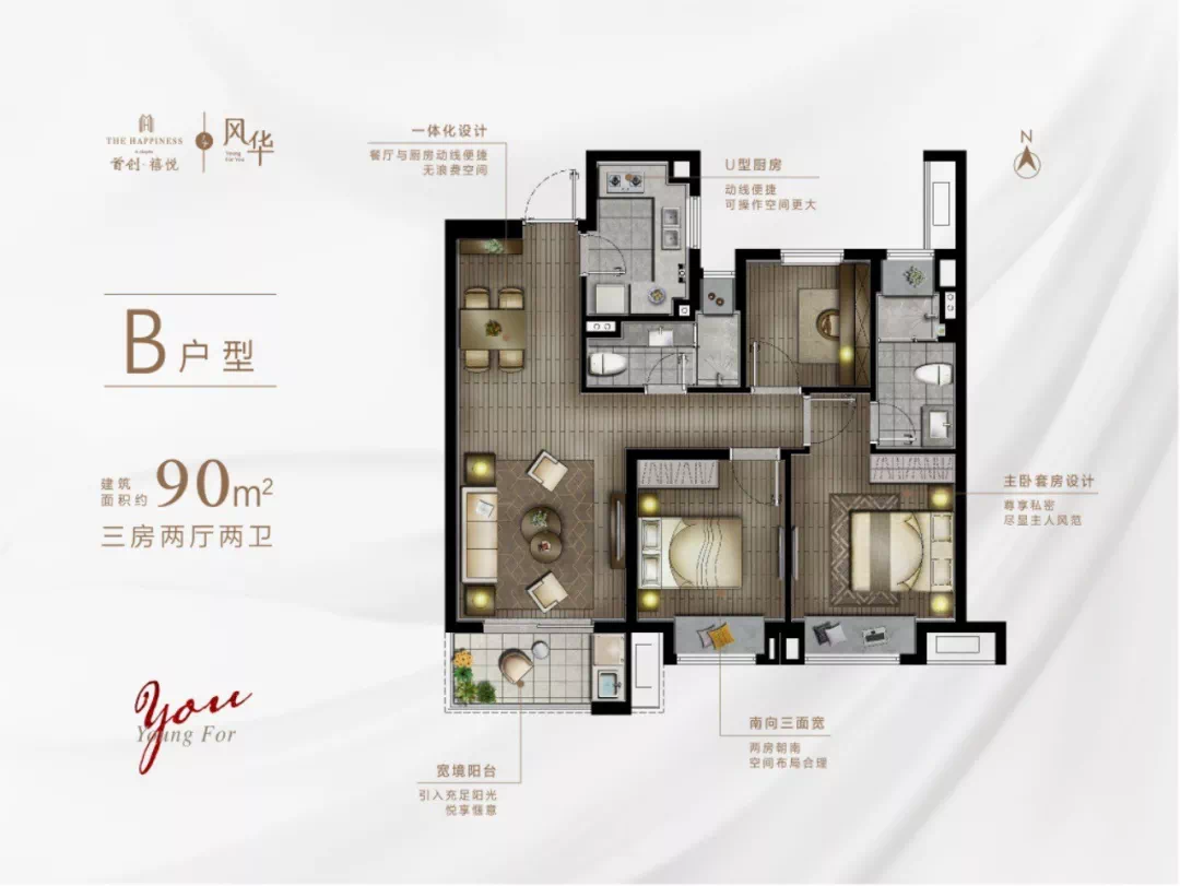 B户型(中间套):90㎡,3房2厅2卫,2梯4户,总高12-13层