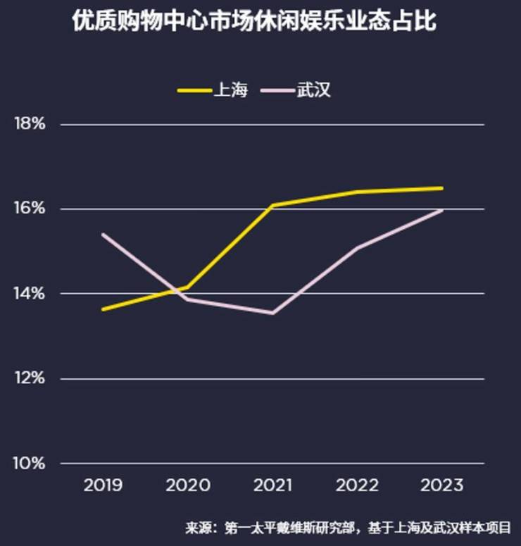 旅游、电影、演出市场在2023年全面恢复,消费者此前积压的文旅消费热情得以充分释放。从商场业态数据来看,购物中心内休闲娱乐业态整体占比在2023年持续提升。在上海,休闲娱乐类业态占比由2019年的13.6%增长至16.5%。运动健身、亲子活动、影院剧场、酒吧演出等多个细分业态涌现新品牌或新内容。此外,消费者对向内精神需求的追求和对文艺展览类空间的品质要求更高,文旅融合有望成为新兴亮点。