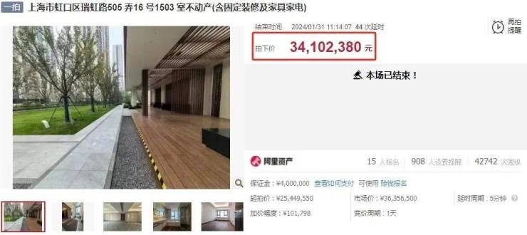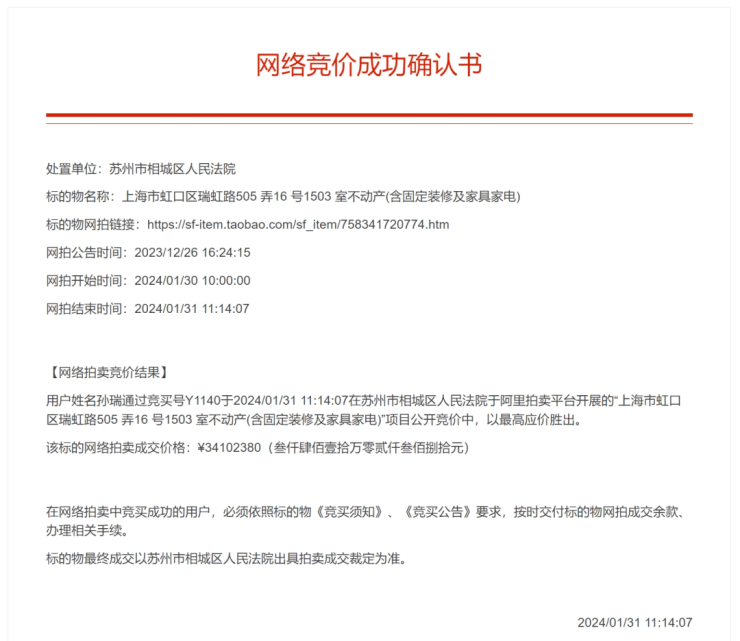 2024年1月31日,苏州相城区法院处理资产,上海市虹口区瑞虹路505弄16号1503室在阿里拍卖网上公开拍卖,起拍价约2545万元,15人报名82次出价,最终以总价3410.2万元成交,折合成交单价17.8万元/㎡。