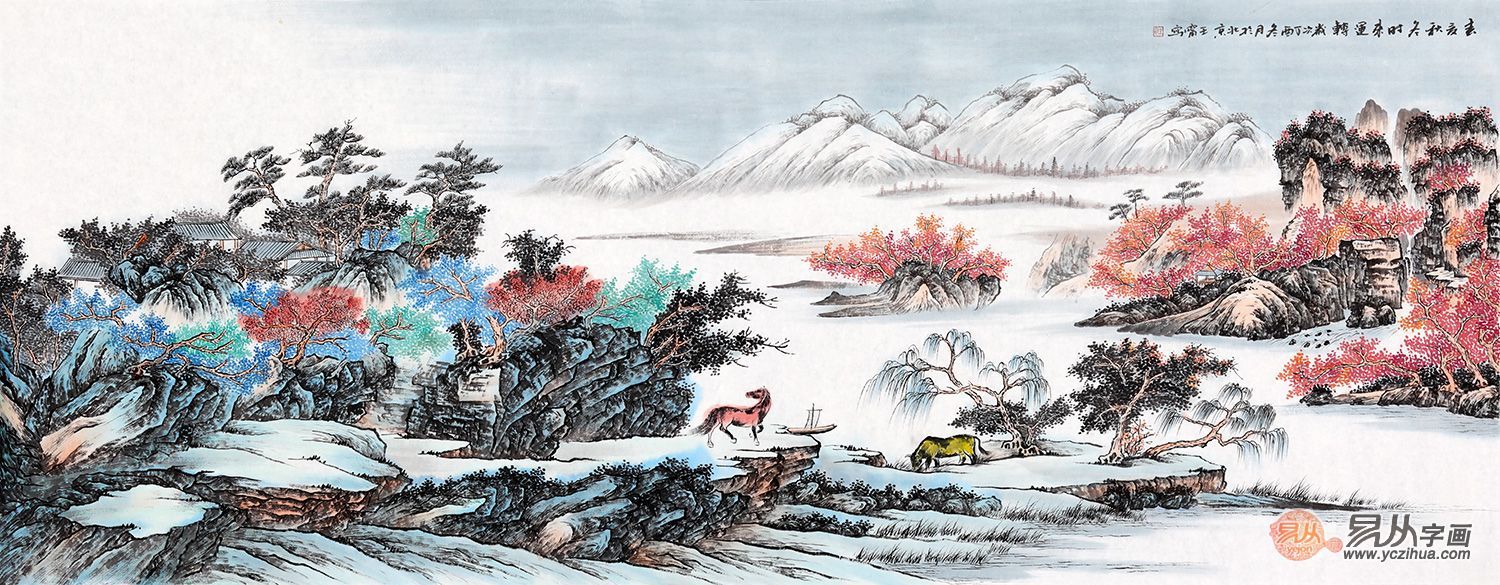 远处山峰层层叠叠,枫林披覆,一片火红,脚下江水悠悠,碧绿清澈,大地理风水格局讲究的是左青龙、右白虎、前朱雀、后玄武,画面构图远虚近实,近景 突兀、远景清雅、墨气明润,浓淡虚实相生。此幅作品画卷生机勃勃,流溢着生命的激情,跳动着生命的神韵,对自然精神的观照。