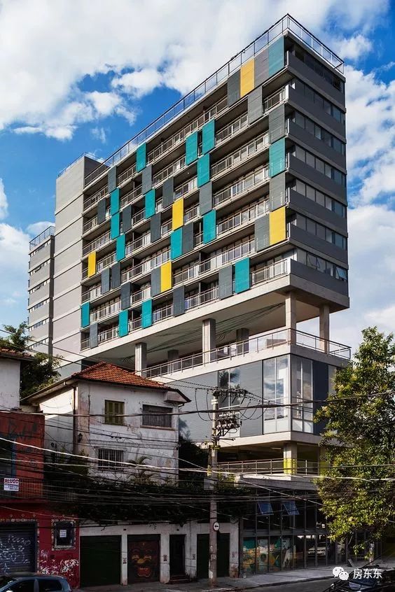 如果有阳台,则可以在分户墙上进行涂刷,这样从各个角度看建筑,可以看得到大小不一的色块,增加视觉丰富度。