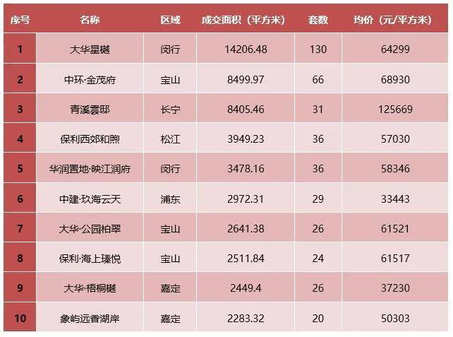 近期“5字头”“6字头”的改善型产品销售较为活跃。从成交前十榜单中看出,有7个楼盘是此类产品。相比之下,前期交易势头活跃的高价房项目并不怎么活跃,榜单上只有1个10万+楼盘,不过排名上倒是位于第三。上周继续释放积极信号,成交榜单中还有签约过百套的楼盘,是闵行浦锦板块的大华星樾,成交1.42万平方米,130套,网上报均价64299元/平方米。