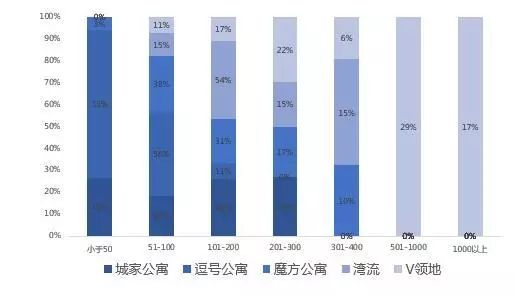 从单店规模来看, 单店房量差异大,市场主流单店规模在200间以内,500间以上的大项目V领地供应较多。单店房量选取城家、逗号、魔方、湾流、V领地5家公寓,进行房量分析。可以看出,白领公寓单店房量大多集中在200间以内;魔方、湾流少量单店在300 - 400间的规模;V领地的单店房量普遍较大,500间以上的门店数占45%,1000间以上的占17%。