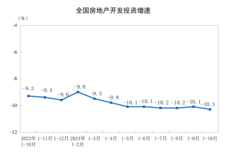 1—10月份,全国房地产开发投资86309亿元,同比下降10.3%(按可比口径计算,详见附注6);其中,住宅投资65644亿元,下降10.4%。