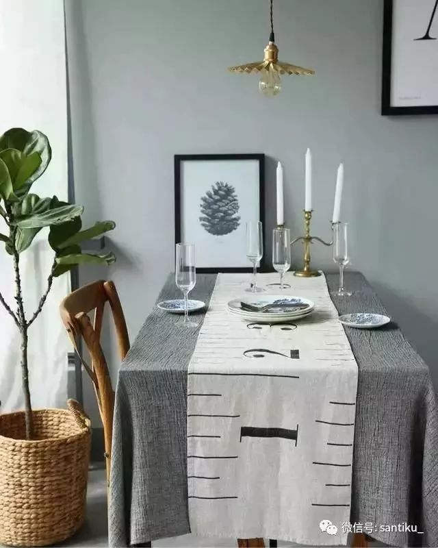 如果不想把整张餐桌遮住,可以试试桌旗。桌旗一般铺在桌子的中线或者对角线上,还可以搭配餐垫使用,桌旗可以起到很好的装饰作用,让餐厅看起来更有情调。