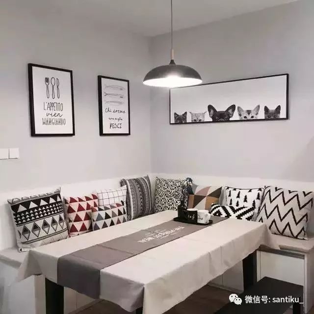 浅色系、图案简单的桌布,是最百搭的桌布。再搭配上相称的几何图形靠枕,用餐氛围瞬间不一样。