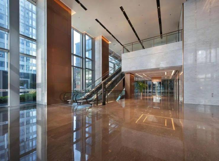 进入首层大堂,抬头可见净高达约10.7米的挑高空间,通过直线加几何折线灯光设计,尽显高端商务氛围。16部三菱电梯,充足客梯数量更高效快速到达各楼层,同时,配备人脸识别闸机系统,让出入更智能、更安全、更便捷,将商务人群“时间就是金钱”的效率意识把控到了极致。