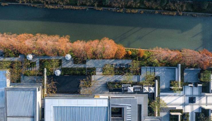 朗拾花语为居者创建了这样一幅舒缓惬意的水岸悦然图景,春申塘、西马屯泾两大天然水系环绕,社区外营造了滨水活力轴和烟火生活轴的十字生态,让整个社区宛若一座水上的自然岛屿。