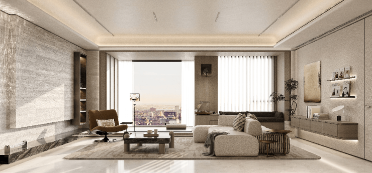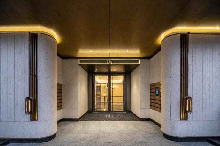 入户大堂内严选太古黑石材及绿野仙踪石材拼嵌,通过水刀石材拼花工艺,营造出从都市精致到松弛度假的情绪过渡。单元入户门头的鎏金门厅设计,手工艺术灯具、海派全自动单元门、人脸识别系统等细节运用,成为新精致青年鲜明的品味标签,引领奢雅新派的都会生活方式。