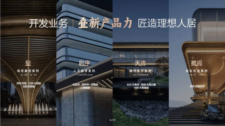 具体到产品体系方面,招商蛇口围绕客户需求及审美的变化,提出了新的3+1产品体系,包括天青、启序、揽阅3大产品线,分别对应现代东方、人文美学、自在乐活的产品风格,以及以“玺”为名的高定豪宅风格顶级产品系列。