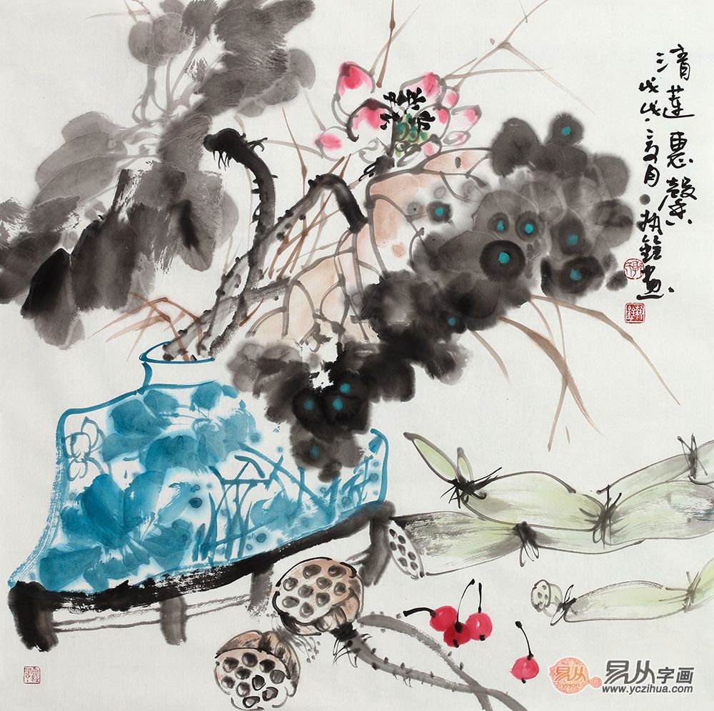 郭执铨斗方花鸟画作品《清莲惠馨》(作品来源:易从网)