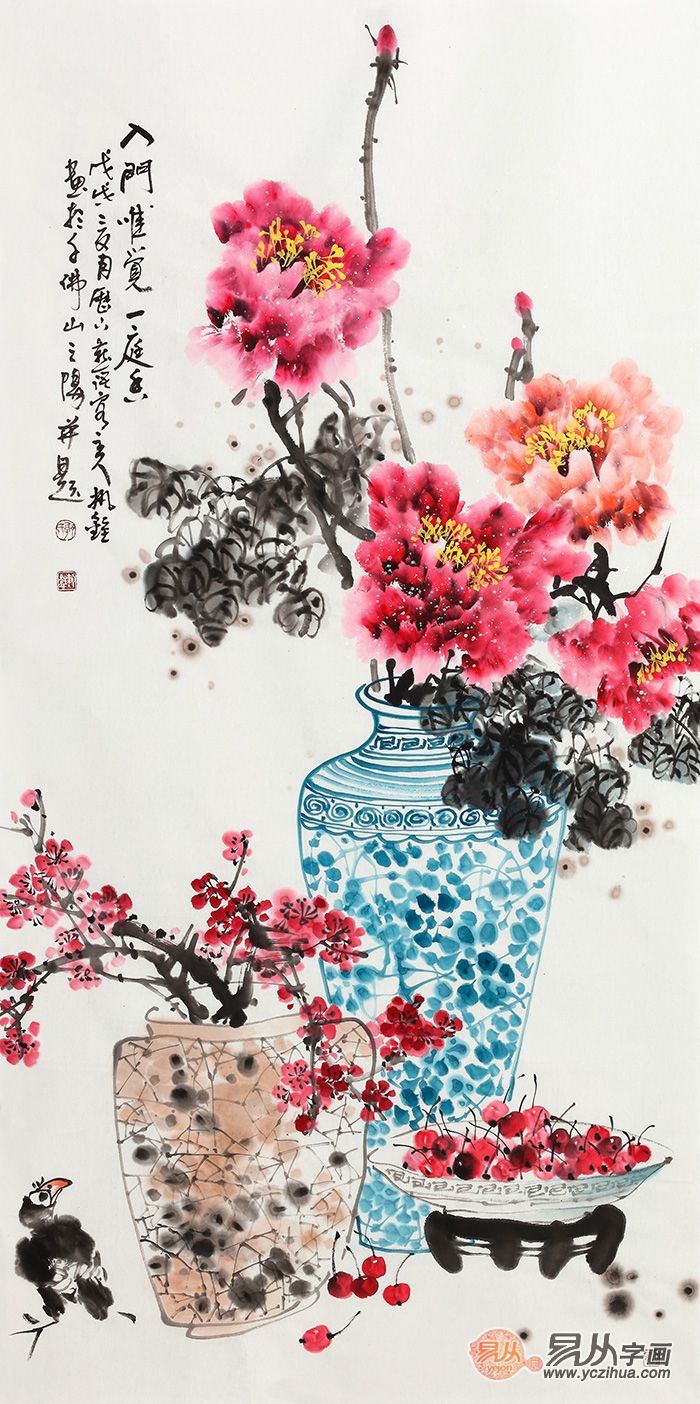 郭执铨的牡丹梅花图《入门唯觉一庭香》(作品来源:易从网)