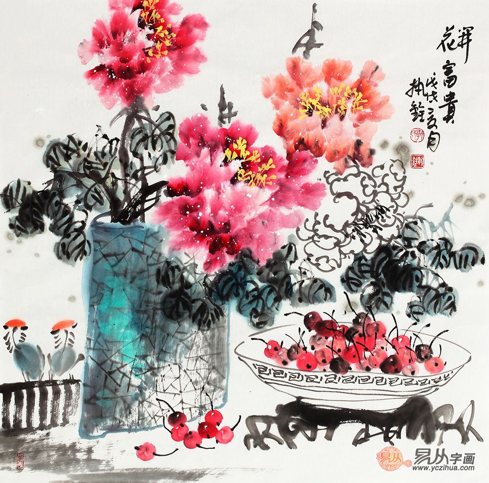 郭执铨斗方国画牡丹图《花开富贵》(作品来源:易从网)