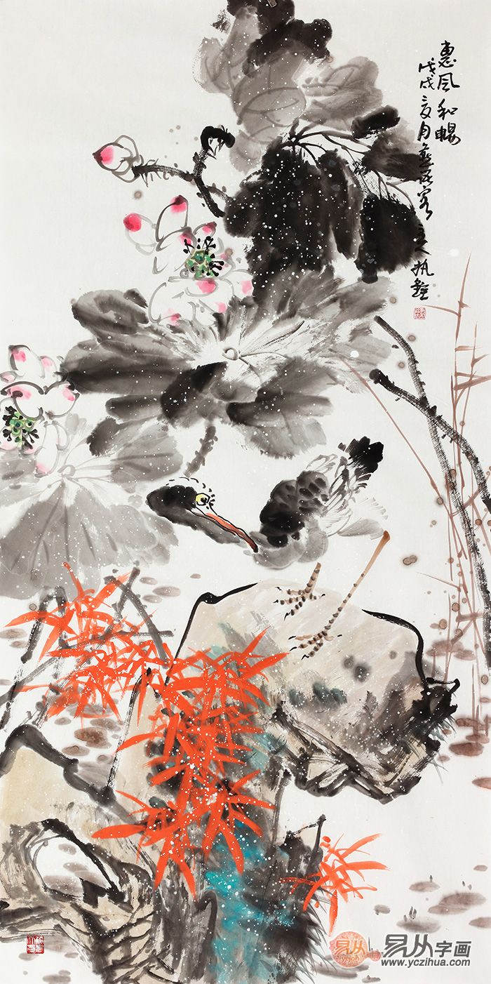 郭执铨四尺竖幅国画荷花图《惠风和畅》(作品来源:易从网)