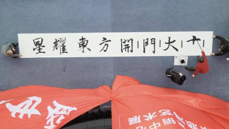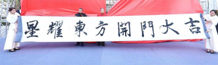 宋鸿发老师身着中国传统服饰,笔锋如游龙婉转,每一次转身书写的动作,都演绎出巍巍东方的千年古韵。这场地书表演意境深远、震撼心扉,让现场的每一个人都感受到了新华·星耀东方传承文脉、创新迭变、致敬亭林的满腔臻意。