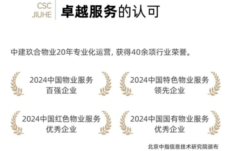 中建玖合物业,自2002年成立至今,深耕京津冀、长三角、粤港澳三大经济圈,积极布局西南、东南等区域核心城市。管理业态包括高端写字楼、商业综合体、央企总部、高标准住宅、医院、学校等,合约管理面积逾600万m'。20余年的服务运营历程,中建玖合物业始终筑牢央企根魂,以"红色物业"为建证初心,荣获多项行业内荣誉。