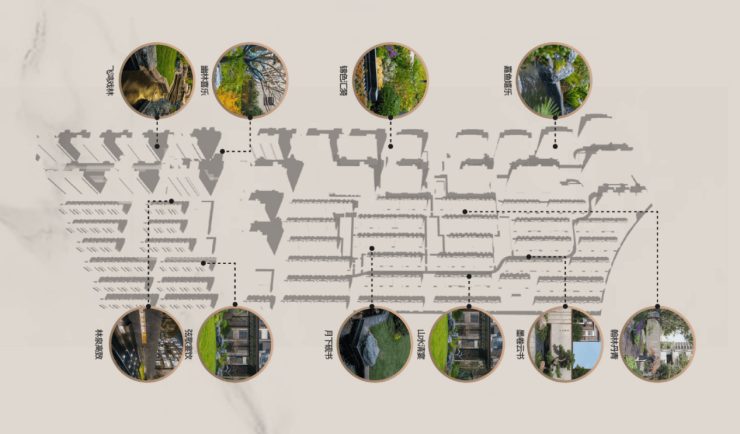 以《西园雅集图记》中植物为蓝本,并考量四季植被,以和时令的树木、花卉营造雅集文化场景。一树玉兰花,赏尽天下春;春尽香橼开,青绿四时赏;八月清桂飘,淡香巷中藏;乌桕赤于枫,园林二月中......高低绿植,四季花卉,水绿相依,繁花盛景;闲庭幽林中,与家人徜徉于四季风景中,精妙之处耐人寻味。